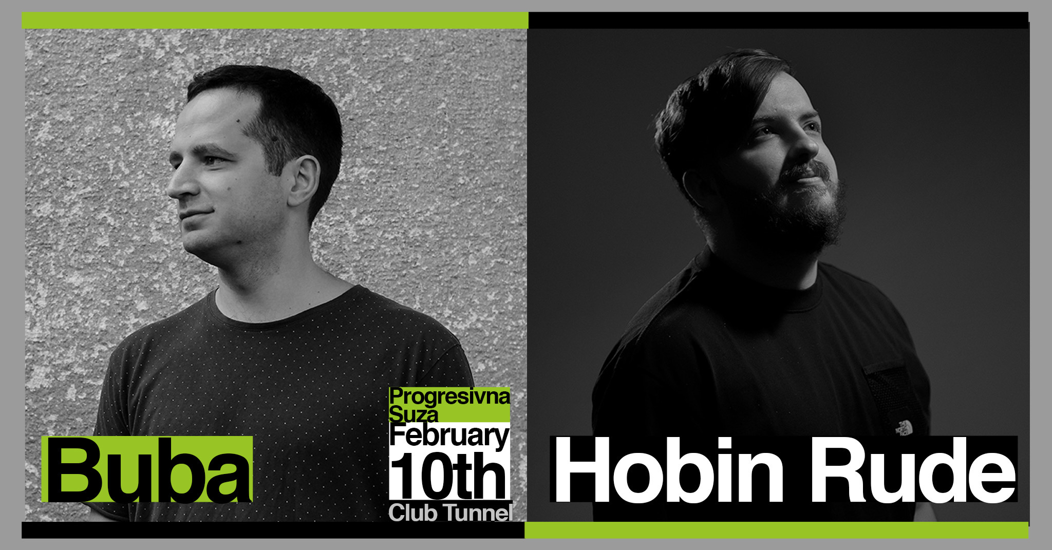 Predstavniku domaće elektronske scene, globalno priznatom producentu Ognjenu Ceroviću aka Hobin Rude, 10. februara u klubu Tunnel, pridružiće se gost iz Crne Gore, Miloš Bulajić aka Buba, jedan od najtalentovanijh di-džejeva i producenata svoje generacije koji je sarađivao sa inostranim izdavačkim kućama i nastupao na najprestižnijim festivalima u regionu.